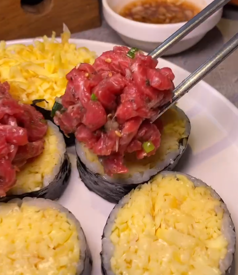 계란 꽉 찬 김밥에 육회 올려 먹으니까 생각보다 잘 어울려서 조금 놀랐어요.
